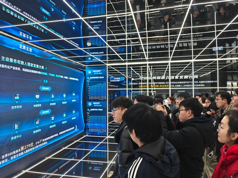 师生一行首先参观了辽宁联通数智化体验中心,深入了解了中国联通在5G、云计算、大数据、人工智能、工业互联网等领域的战略布局与创新实践。在中心展厅,工作人员结合丰富的应用场景,系统展示了联通AI技术在教育、医疗、工业、城市治理等多个领域的深度融合与创新成果。在智慧教育板块,同学们体验到AI个性化教学、虚拟仿真实验等前沿应用;在智慧医疗展区,远程诊疗、AI辅助诊断等技术展现了科技如何赋能健康服务;而在工业互联网平台前,基于5G+AI的智能制造,引发了在场师生对未来技术赋能产业转型的深入思考。